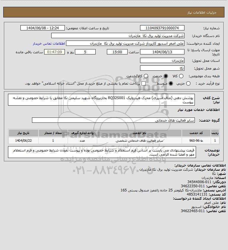 شرح کلی نیاز: پوشش دهی (متال اسپری) محرک هیدرولیک RQ32S001 بخارنیروگاه شهید سلیمی نکا