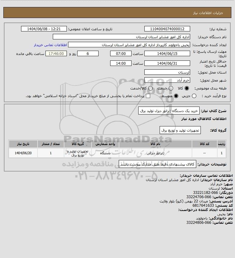 شرح کلی نیاز: خرید یک دستگاه ژنراتور دیزل تولید برق