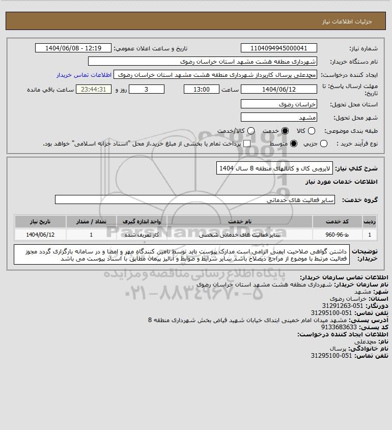 شرح کلی نیاز: لایروبی کال و کانالهای منطقه 8 سال 1404