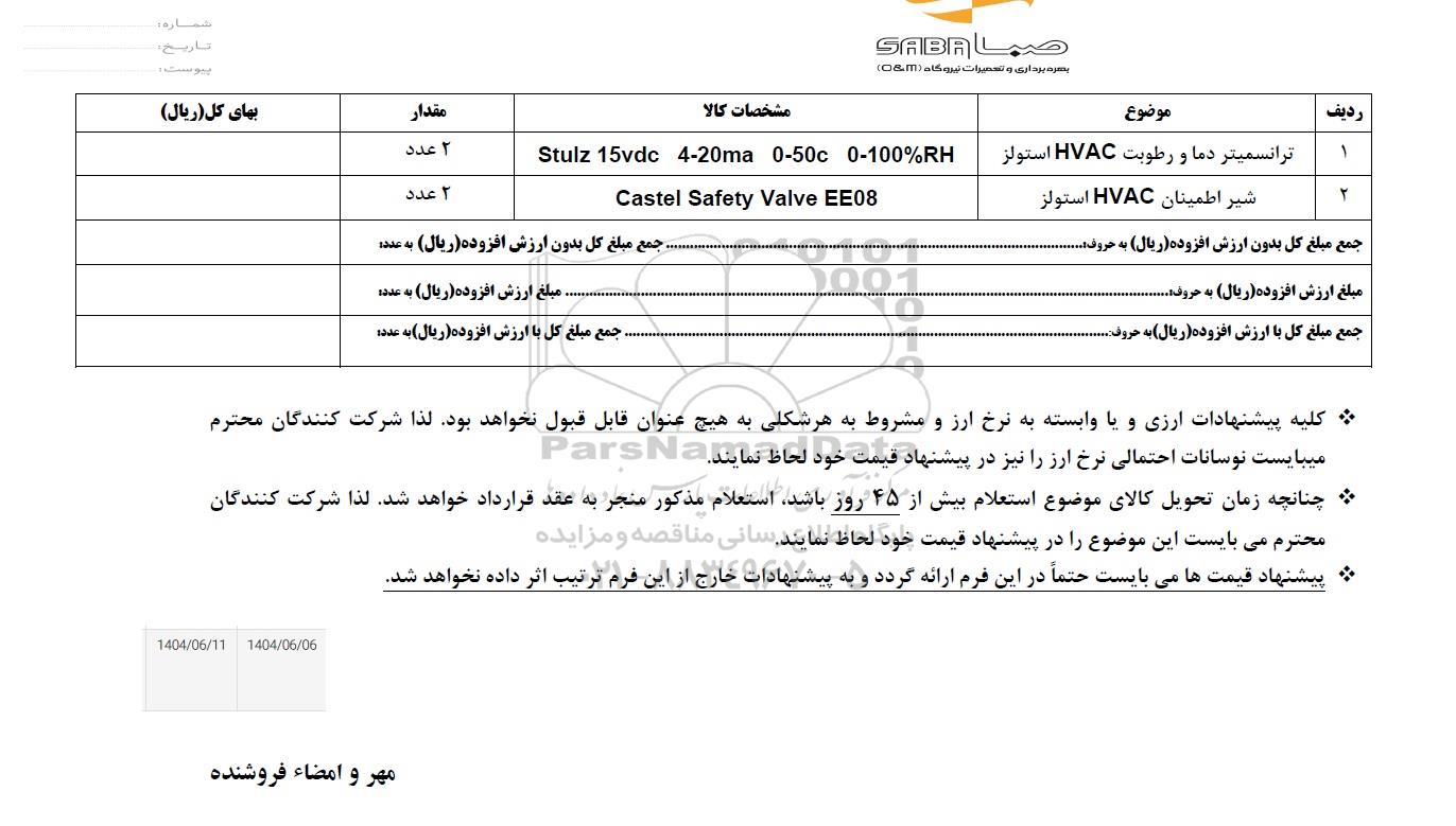 نحوه دریافت اسناد و ارسال پیشنهاد: متقاضیان میتوانند با ثبت نام در سامانه مناقصات و مزایدات ایران (پارس نماد) نسبت به مشاهده اسناد استعلام، دریافت اطلاعات تکمیلی، و ثبت پیشنهاد قیمت خود اقدام نمایند. در صورت نیاز به دریافت راهنمایی یا پشتیبانی در خصوص استعلام و مناقصه و فراخوان مناقصه عمومی، مناقصه محدود، مناقصه بین المللی، مناقصه دولتی، مناقصه خصوصی، مناقصه آنلاین فروش تجهیزات، مناقصه مشاورهای مناقصه پتروشیمی و انرژی مناقصه صنایع و تجهیزات برق و مخابرات و نفت و گاز ... لطفاً با سایت خبری مناقصه و مزایده پارسنماد دادهها به شماره 88349670 تماس حاصل فرمایید.