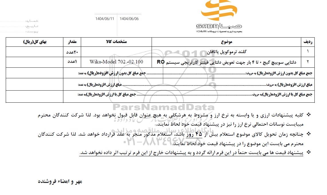 نحوه دریافت اسناد و ارسال پیشنهاد: متقاضیان میتوانند با ثبت نام در سامانه مناقصات و مزایدات ایران (پارس نماد) نسبت به مشاهده اسناد استعلام، دریافت اطلاعات تکمیلی، و ثبت پیشنهاد قیمت خود اقدام نمایند. در صورت نیاز به دریافت راهنمایی یا پشتیبانی در خصوص استعلام و مناقصه و فراخوان مناقصه عمومی، مناقصه محدود، مناقصه بین المللی، مناقصه دولتی، مناقصه خصوصی، مناقصه آنلاین فروش تجهیزات، مناقصه مشاورهای مناقصه پتروشیمی و انرژی مناقصه صنایع و تجهیزات برق و مخابرات و نفت و گاز ... لطفاً با سایت خبری مناقصه و مزایده پارسنماد دادهها به شماره 88349670 تماس حاصل فرمایید.
