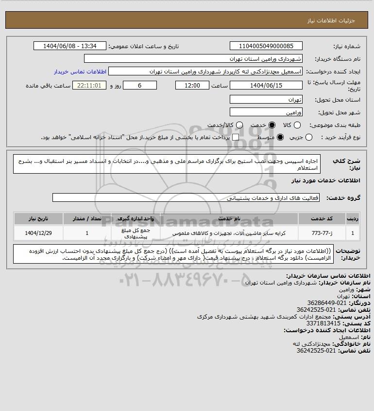شرح کلی نیاز: اجاره اسپیس وجهت نصب استیج برای برگزاری مراسم ملی و مذهبی و....در انتخابات و انسداد مسیر بنر استقبال و... بشرح استعلام