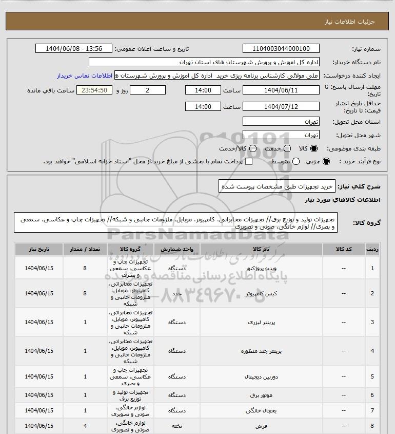 | 3 | -- | پرینتر لیزری | دستگاه | تجهیزات مخابراتی، کامپیوتر، موبایل، ملزومات جانبی و شبکه | 1 | 1404/06/15 |