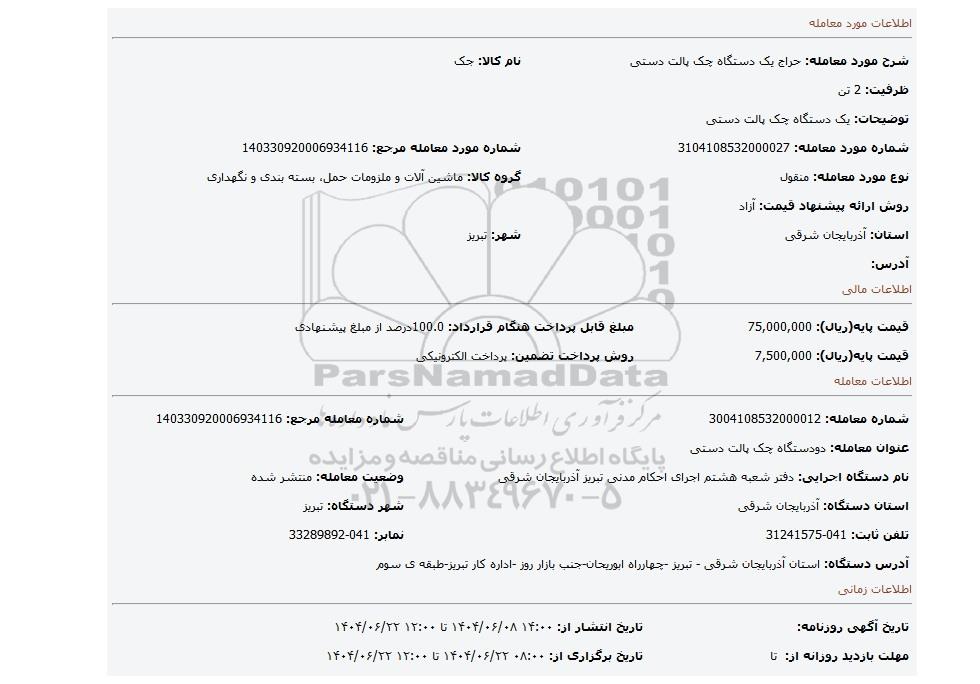 مزایده یک دستگاه چک پالت دستی, مزایده، یک دستگاه چک پالت دستی