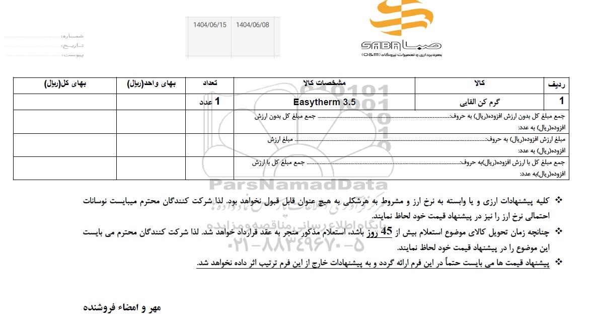 استعلام بها و موضوع استعلام استعلام گرم کن القایی به اطلاع کلیه شرکتها و افراد متخصص واجد شرایط میرساند، آگهی گذار در نظر دارد از طریق استعلام بها، نسبت به انتخاب و دریافت پیشنهادات اقدام نماید. این استعلام با کد آگهی ثبت شده در سامانه خبرگزاری پارس نماد : 9475465 منتشر شده است. مشخصات استعلام : تاریخ شروع استعلام: 1404/06/08 آخرین مهلت ارسال پیشنهاد قیمت : 1404/06/15 و محل اجرای پروژه : استان سایر میباشد. استعلام قیمت مورد درخواست : استعلام گرم کن القایی با دستهبندیهای تخصصی و گروه های مرتبط : صنایع حرارتی و برودتی, نیروگاه, تجهیزات برق و الکترونیک, استعلام اطلاع رسانی میگردد. شرایط شرکت در استعلام آنلاین : ابتدا ثبت نام در سامانه استعلام پارس نماد و تکمیل مدارک موردنیاز و بارگذاری در سامانه رعایت تمامی ضوابط و الزامات مندرج در اسناد استعلام است.