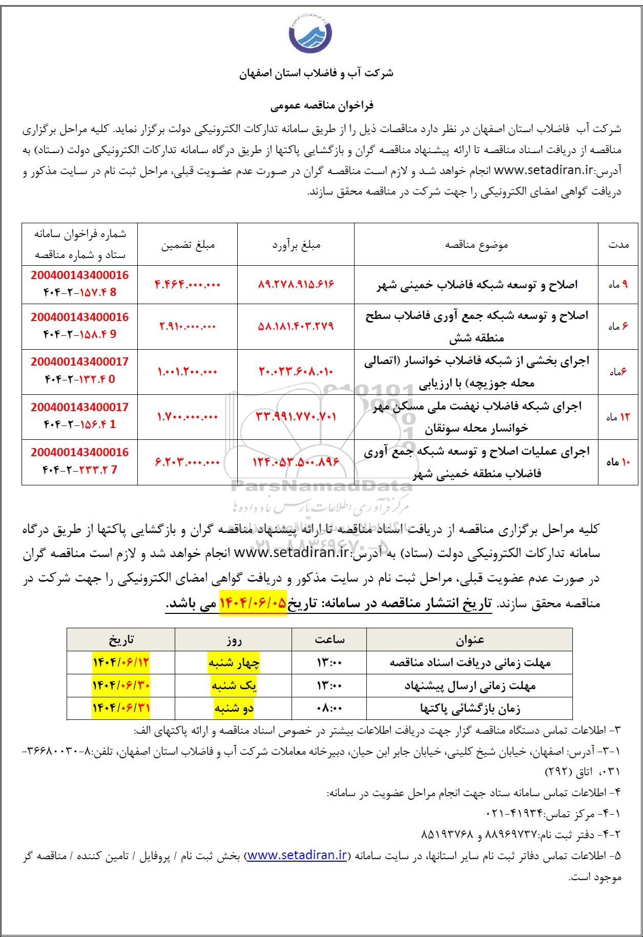 | 9 ماه | اصلاح و توسعه شبکه فاضلاب خمینی شهر | 89.278.915.616 | 4.464.000.000 | 2004001434000168 404-2-157.4 |