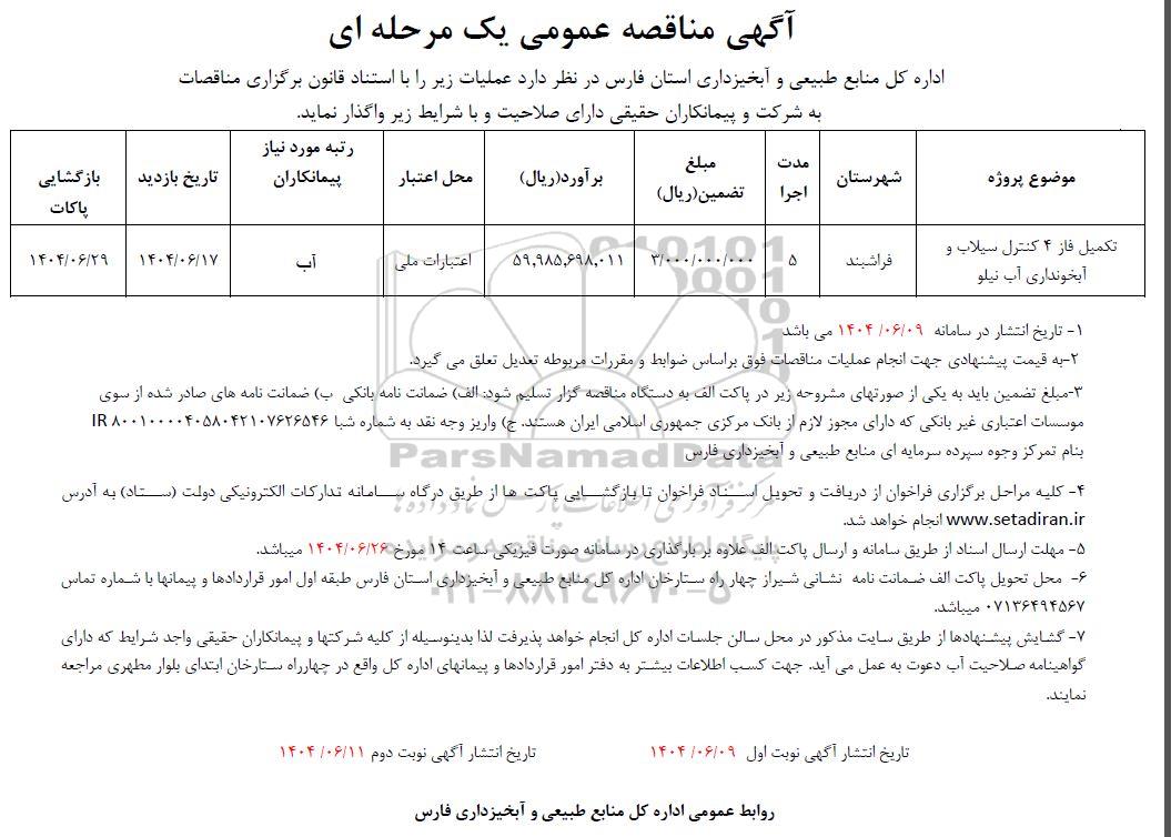 تکمیل فاز 4 کنترل سیلاب و آبخونداری آب نیلو فراشبند 3.000.000.000 59.985.698.011 اعتبارات ملی آب 1404.6.17 1404.6.29