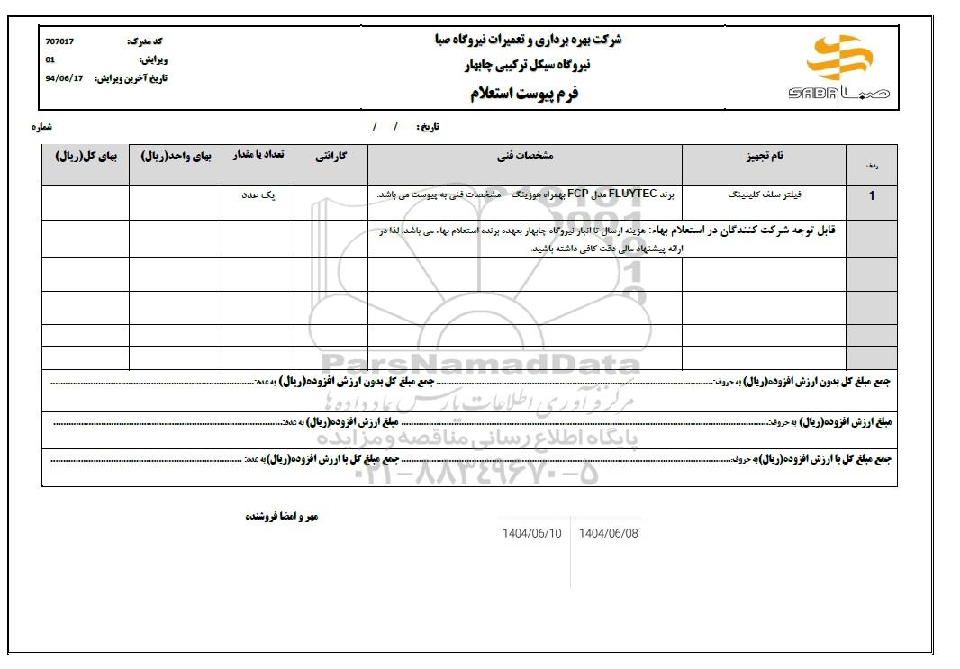 استعلام بها و موضوع استعلام استعلام فیلتر سلف کلینینگ ... به اطلاع کلیه شرکتها و افراد متخصص واجد شرایط میرساند، آگهی گذار در نظر دارد از طریق استعلام بها، نسبت به انتخاب و دریافت پیشنهادات اقدام نماید. این استعلام با کد آگهی ثبت شده در سامانه خبرگزاری پارس نماد : 9475643 منتشر شده است. مشخصات استعلام : تاریخ شروع استعلام: 1404/06/08 آخرین مهلت ارسال پیشنهاد قیمت : 1404/06/10 و محل اجرای پروژه : استان سیستان و بلوچستان میباشد. استعلام قیمت مورد درخواست : استعلام فیلتر سلف کلینینگ ... با دستهبندیهای تخصصی و گروه های مرتبط : انواع فیلتر های تصفیه, نیروگاه, تجهیزات برق و الکترونیک, استعلام اطلاع رسانی میگردد. شرایط شرکت در استعلام آنلاین : ابتدا ثبت نام در سامانه استعلام پارس نماد و تکمیل مدارک موردنیاز و بارگذاری در سامانه رعایت تمامی ضوابط و الزامات مندرج در اسناد استعلام است.