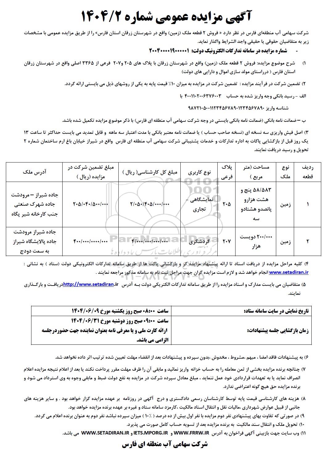 مزایده فروش 2 قطعه ملک (زمین) واقع در شهرستان زرقان استان فارس