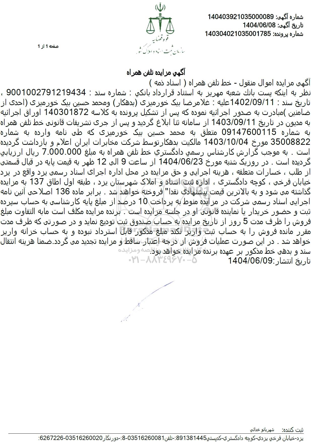 مزایده عمومی مزایده خط تلفن همراه برگزار میگردد. از کلیه افراد متخصص و شرکتهای واجد شرایط دعوت به عمل میآید تا در این مزایده با کد خبرگزاری پارس نماد : 9475835 شرکت نمایند تاریخ شروع مزایده : 1404/06/08 مهلت شرکت در مزایده: تا پایان روز 1404/06/23 مکان برگزاری اموال واگذاری استانهای یزد و دستهبندیهای مربوط به این حراجی متفرقه, واگذاری و فروش سیم کارت میباشد.