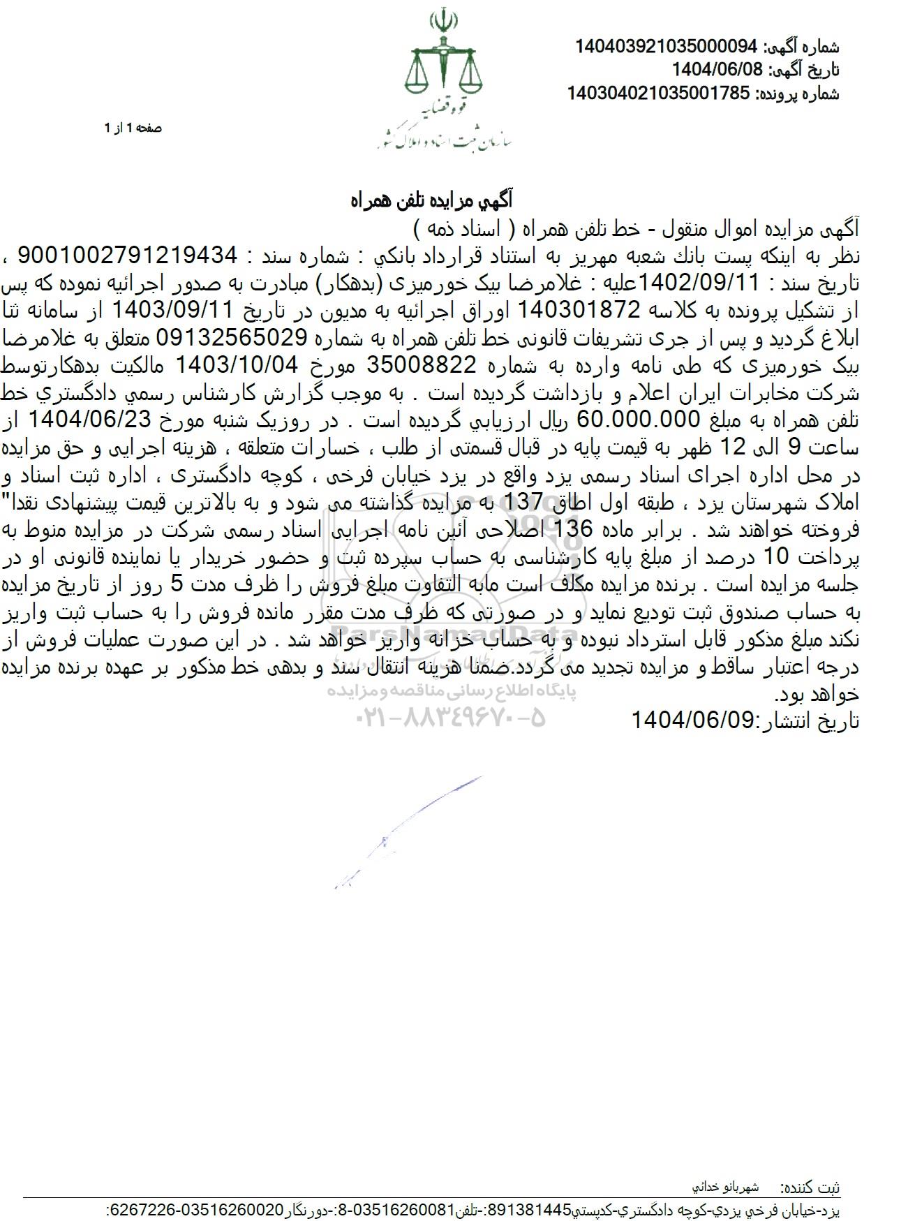 مزایده فروش خط تلفن همراه به شماره 09132565029