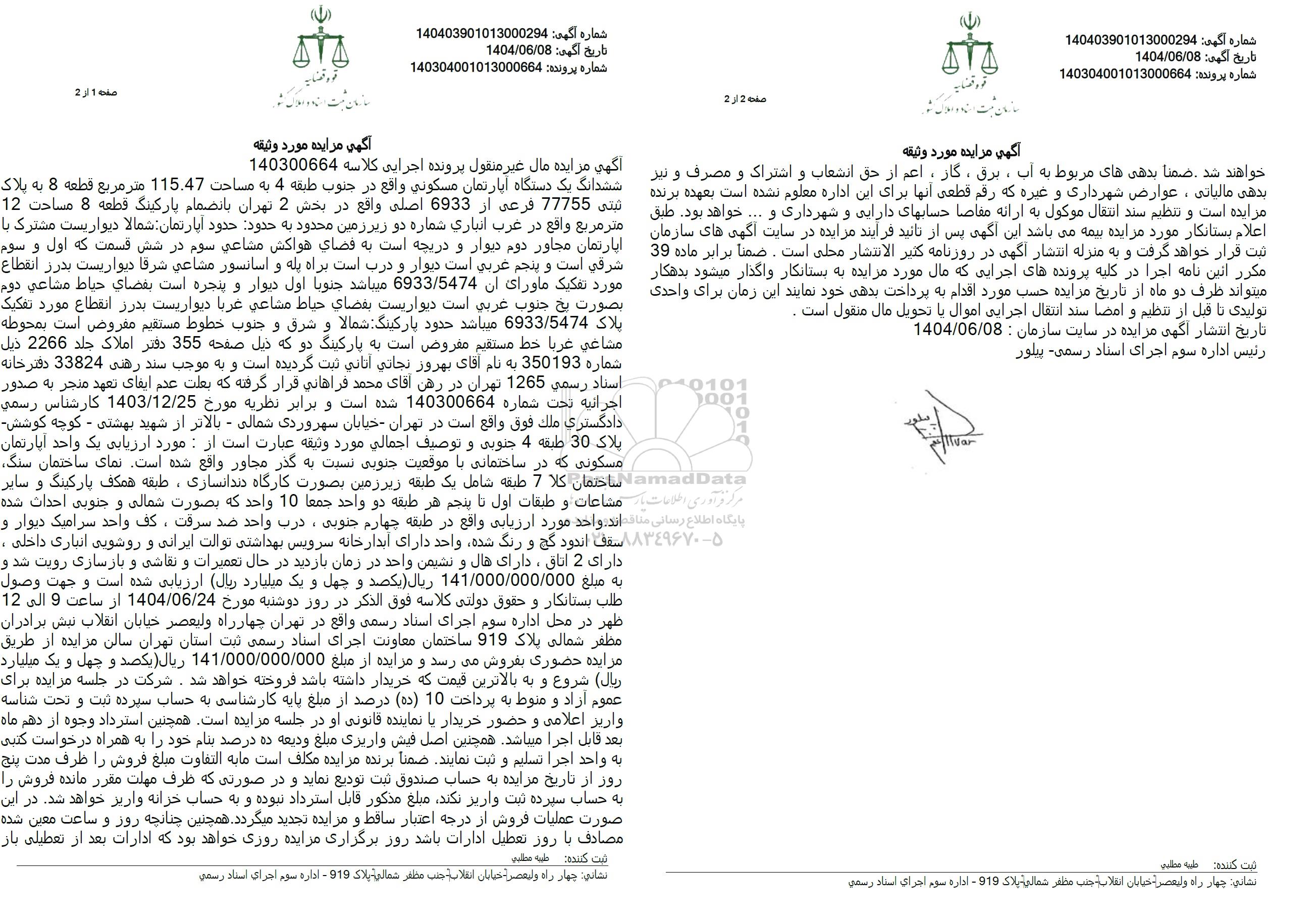 مزایده فروش ششدانگ یک دستگاه آپارتمان مسکونی واقع در جنوب طبقه 4 به مساحت 115.47 متر مربع قطعه 8 به پلاک ثبتی 77755 فرعی از 6933 اصلی واقع در بخش 2 تهران