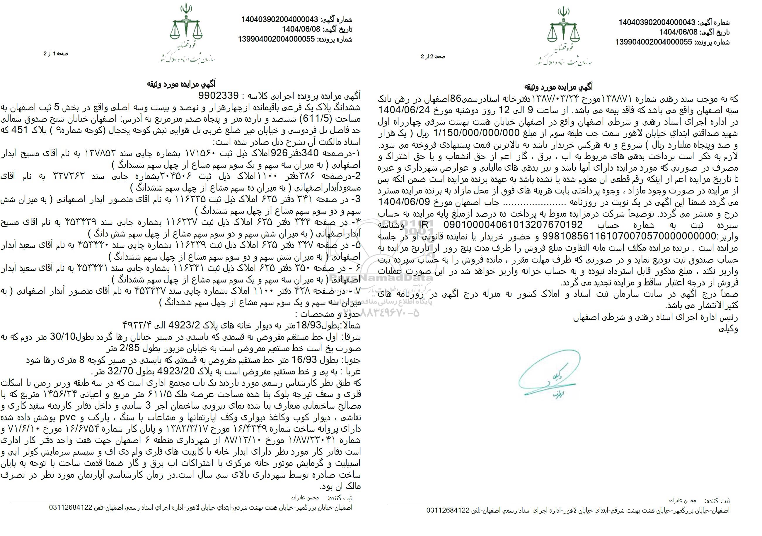 مزایده فروش ملک به مساحت 611.5 مترمربع به پلاک ثبتی 4923 اصلی