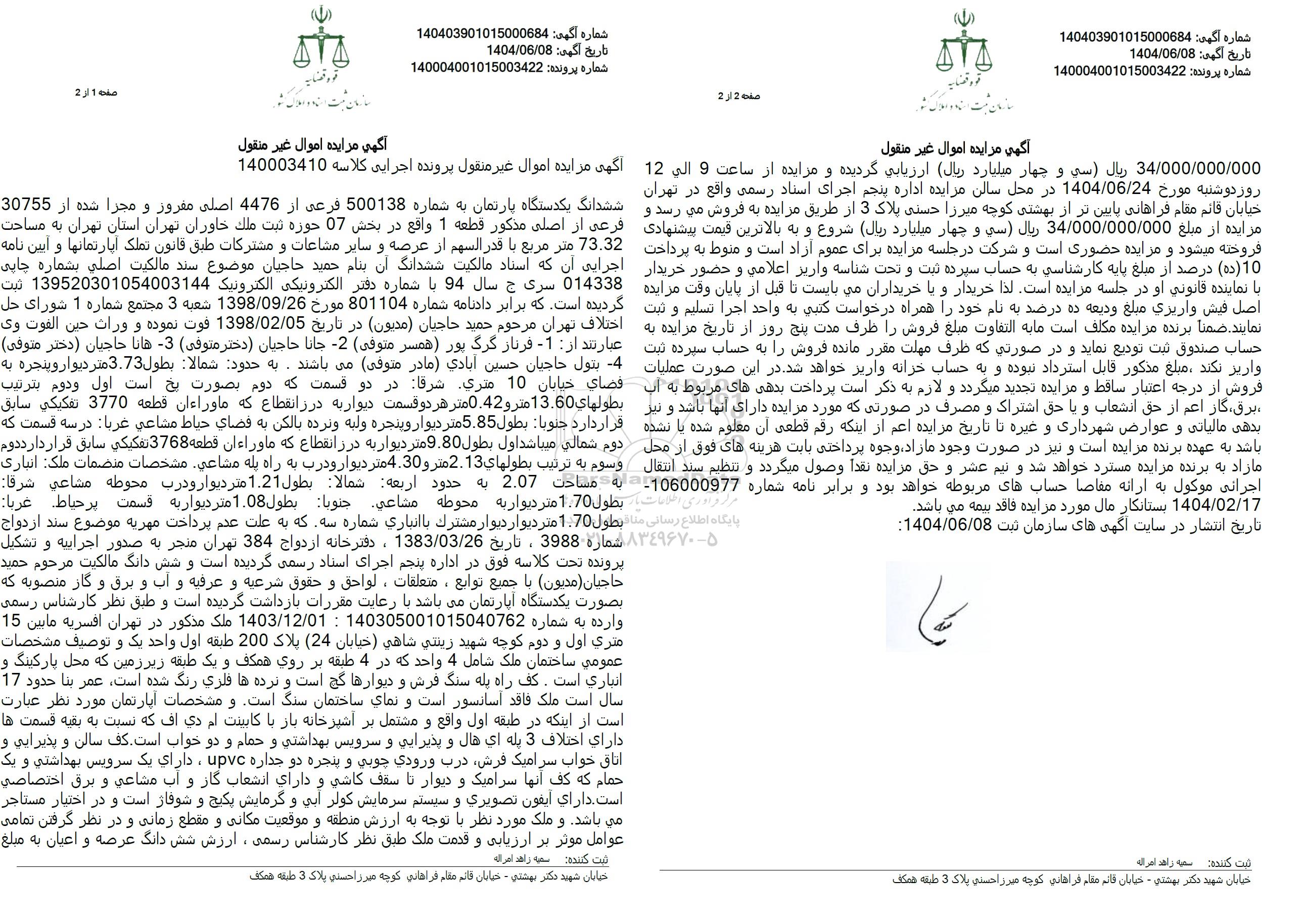 ششدانگ یک دستگاه آپارتمان به شماره 500138 فرعی از 4476 اصلی به مساحت 73.32 مترمربع به ارزش 34.000.000.000 ریال