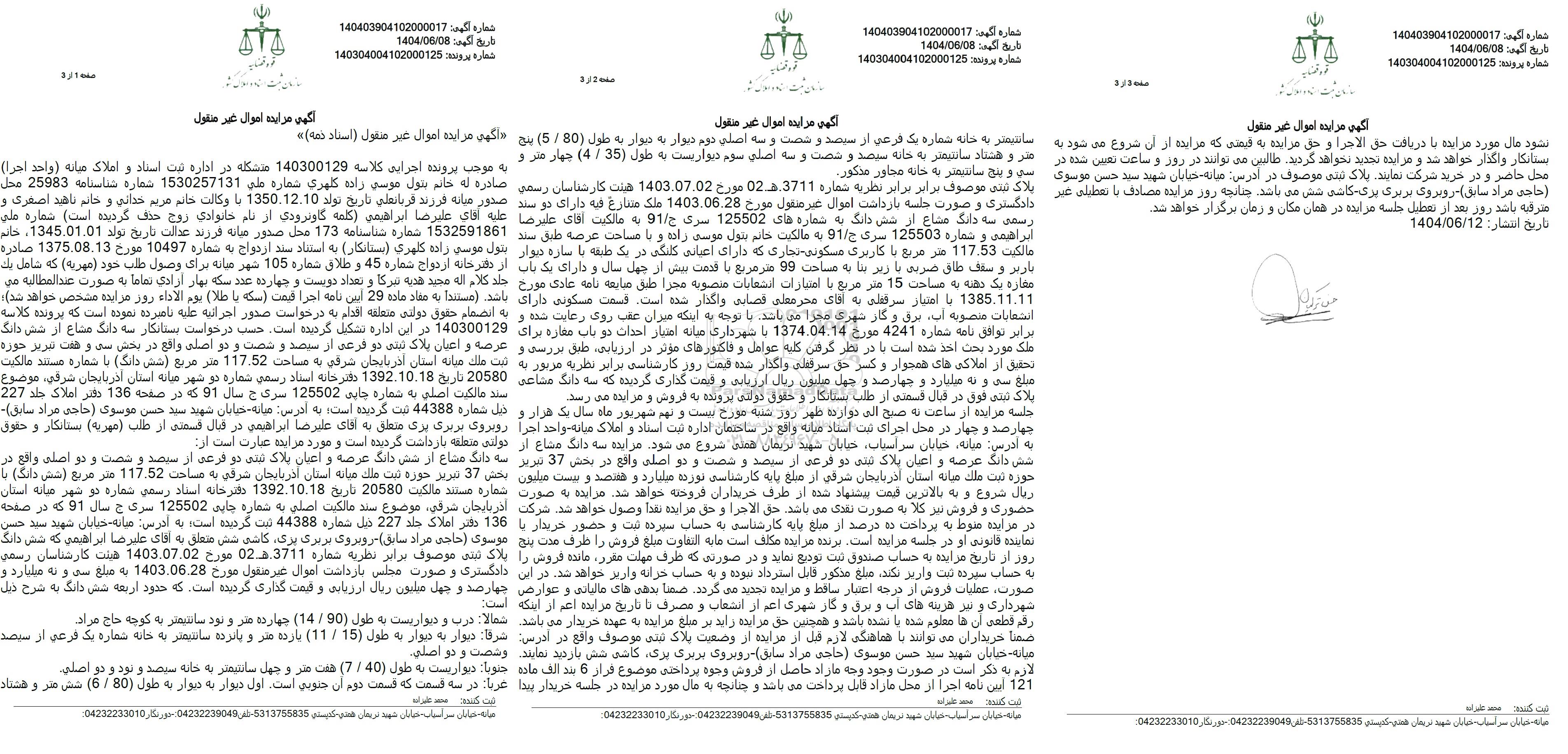 مزایده فروش پلاک ثبتی دو فرعی از سیصد و شصت و دو اصلی