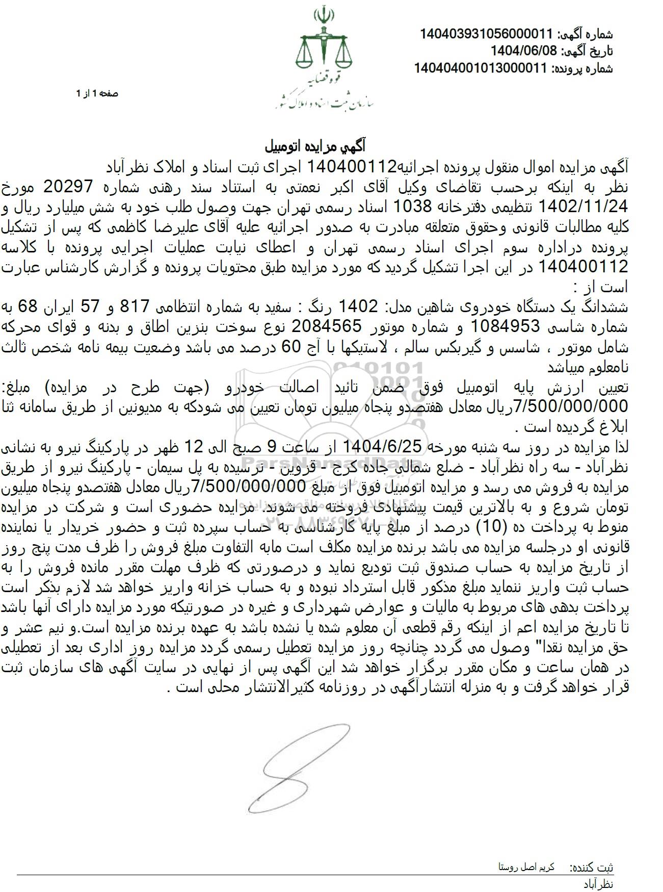 مزایده فروش یکدستگاه خودروی شاهین مدل 1402 به مبلغ 7.500.000.000 ریال