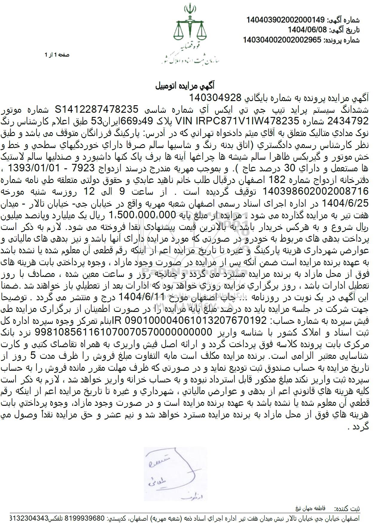 مزایده عمومی مزایده فروش پراید تیپ جی تی ایکس آی برگزار میگردد. از کلیه افراد متخصص و شرکتهای واجد شرایط دعوت به عمل میآید تا در این مزایده با کد خبرگزاری پارس نماد : 9475925 شرکت نمایند تاریخ شروع مزایده : 1404/06/08 مهلت شرکت در مزایده: تا پایان روز 1404/06/25 مکان برگزاری اموال واگذاری استانهای اصفهان و دستهبندیهای مربوط به این حراجی انواع خودرو سبک میباشد.