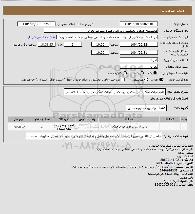 نام دستگاه خریدار:موسسه خدمات بهداشتی درمانی میلاد سلامت تهران