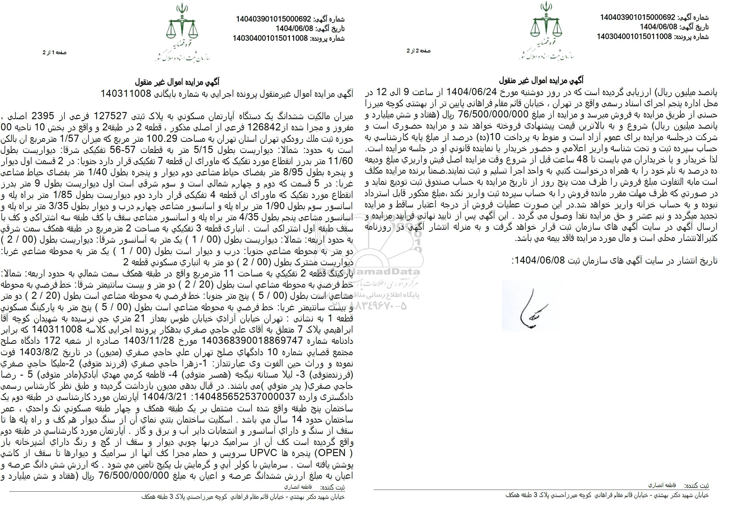 مزایده فروش ششدانگ یک دستگاه آپارتمان مسکونی پلاک ثبتی 127527 فرعی