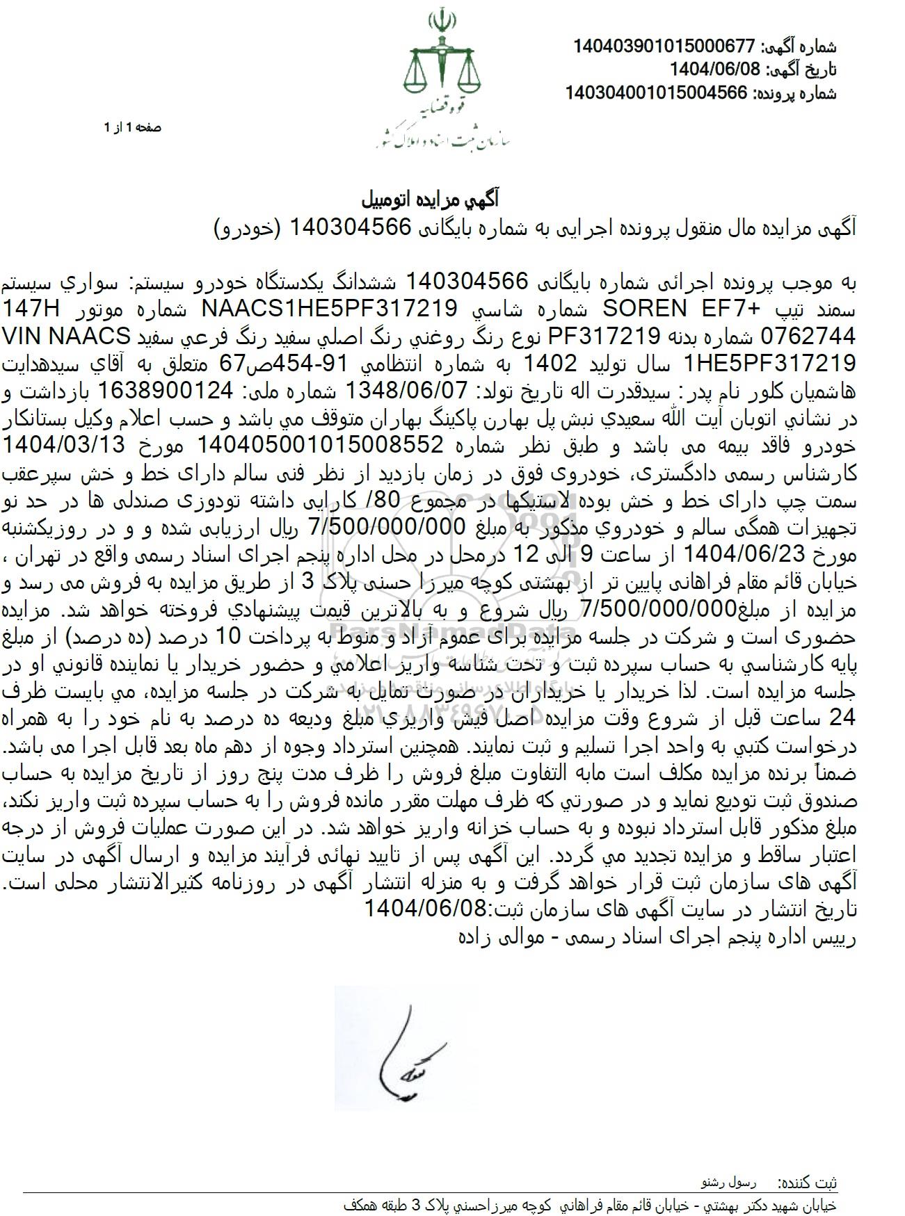 مزایده ششدانگ یکدستگاه خودرو سیستم سواری سمند تیپ soren ef7 , مزایده ششدانگ یکدستگاه خودرو سیستم سواری سمند تیپ soren ef7