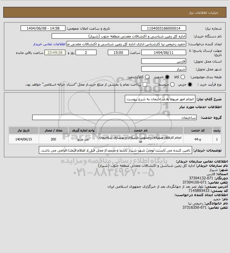 نام دستگاه خریدار:اداره کل زمین شناسی و اکتشافات معدنی منطقه جنوب (شیراز)