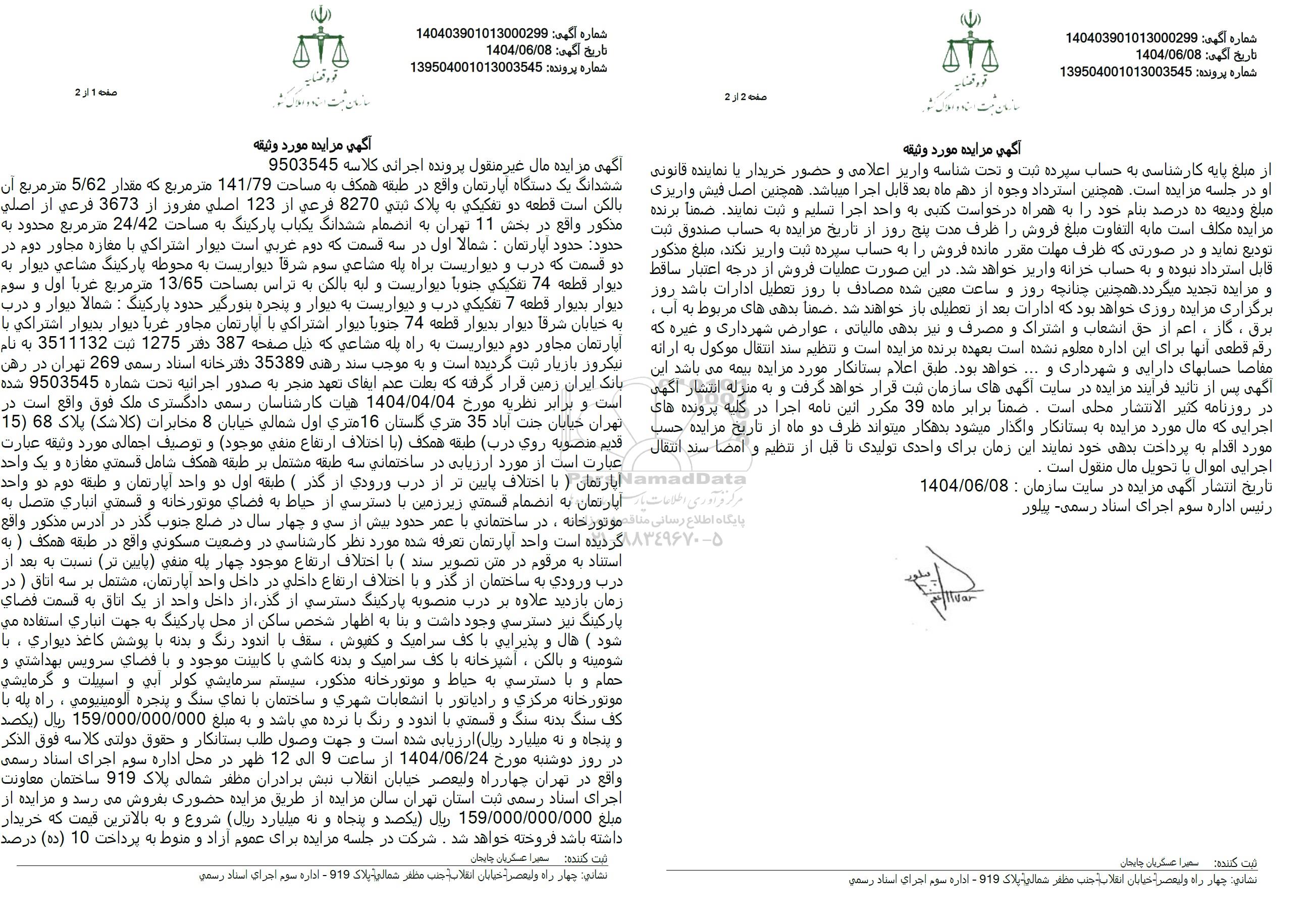 موضوع مزایده : یک دستگاه آپارتمان به مساحت 141/79 مترمربع تحت پلاک ثبتی 8270 فرعی از 123 اصلی مفروز از 3673 فرعی از اصلی به ارزش 159.000.000.000 ریال