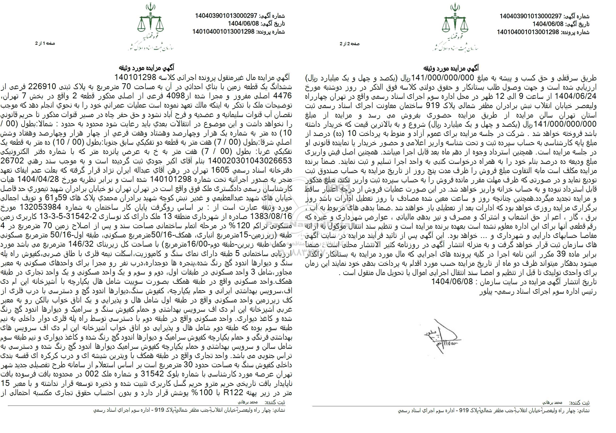 3 مزایده ششدانگ عرصه و اعیان یک قطعه آپارتمان نوع ملک طلق به پلاک ثبتی 72499 فرعی از 6933 اصلی 9708835 1404/07/24 new not special not payed تهران