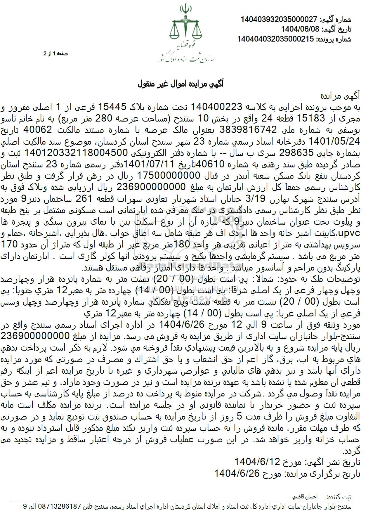 مزایده فروش پلاک 15445 فرعی از 1 اصلی , مزایده فروش پلاک 15445 فرعی از 1 اصلی