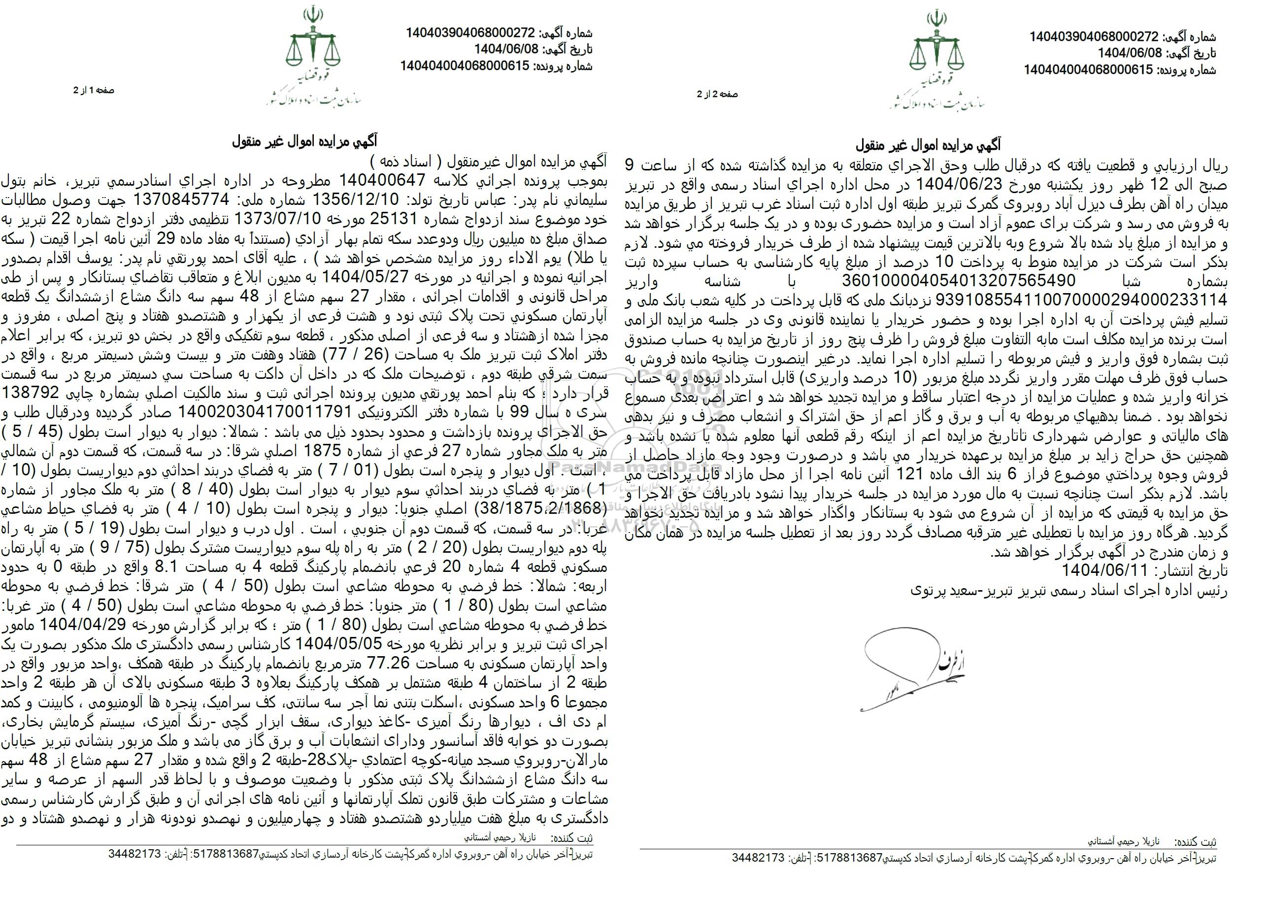 3 مزایده ششدانگ عرصه و اعیان یک قطعه آپارتمان نوع ملک طلق به پلاک ثبتی 72499 فرعی از 6933 اصلی 9708835 1404/07/24 new not special not payed تهران