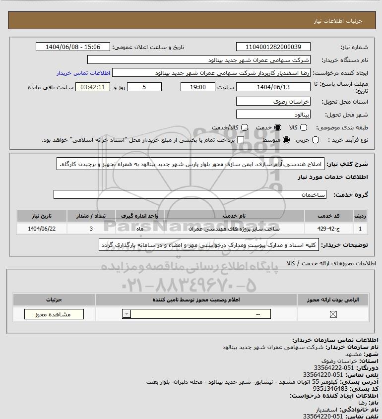 نام دستگاه خریدار:شرکت سهامی عمران شهر جدید بینالود