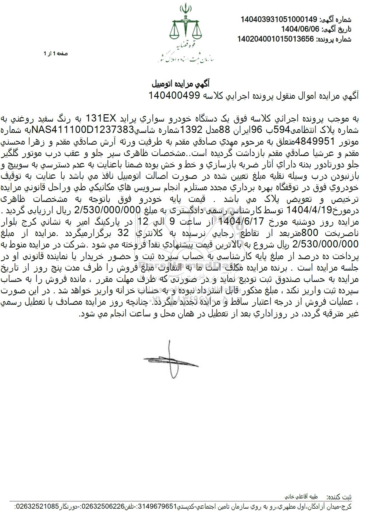 مزایده یکدستگاه خودروی سواری پراید 131EX به رنگ سفید روغنی مدل 1392