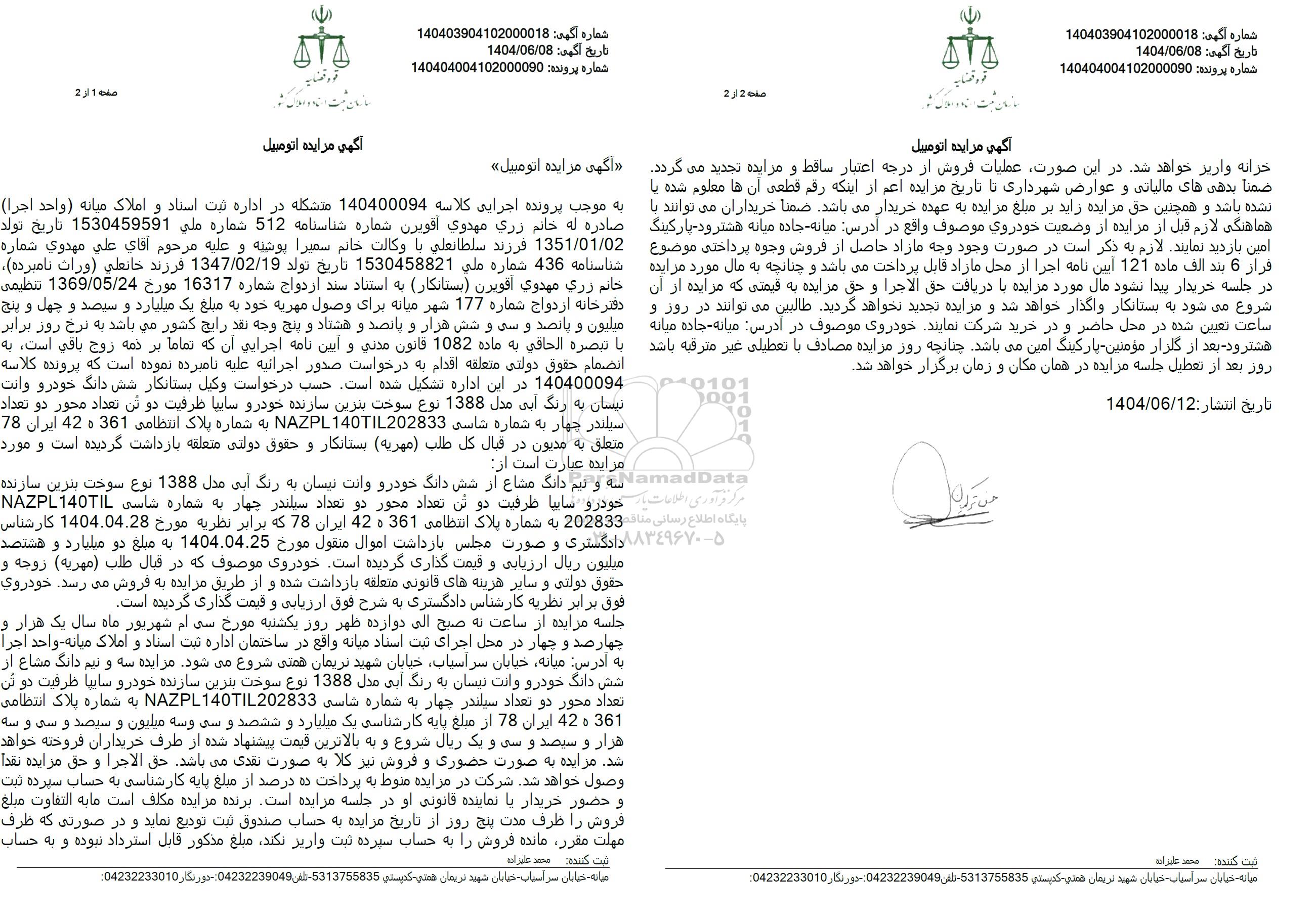 1 مزایده ششدانگ یک دستگاه نیسان وانت زامیاد 9708825 1404/07/24 new not special not payed آذربایجان شرقی