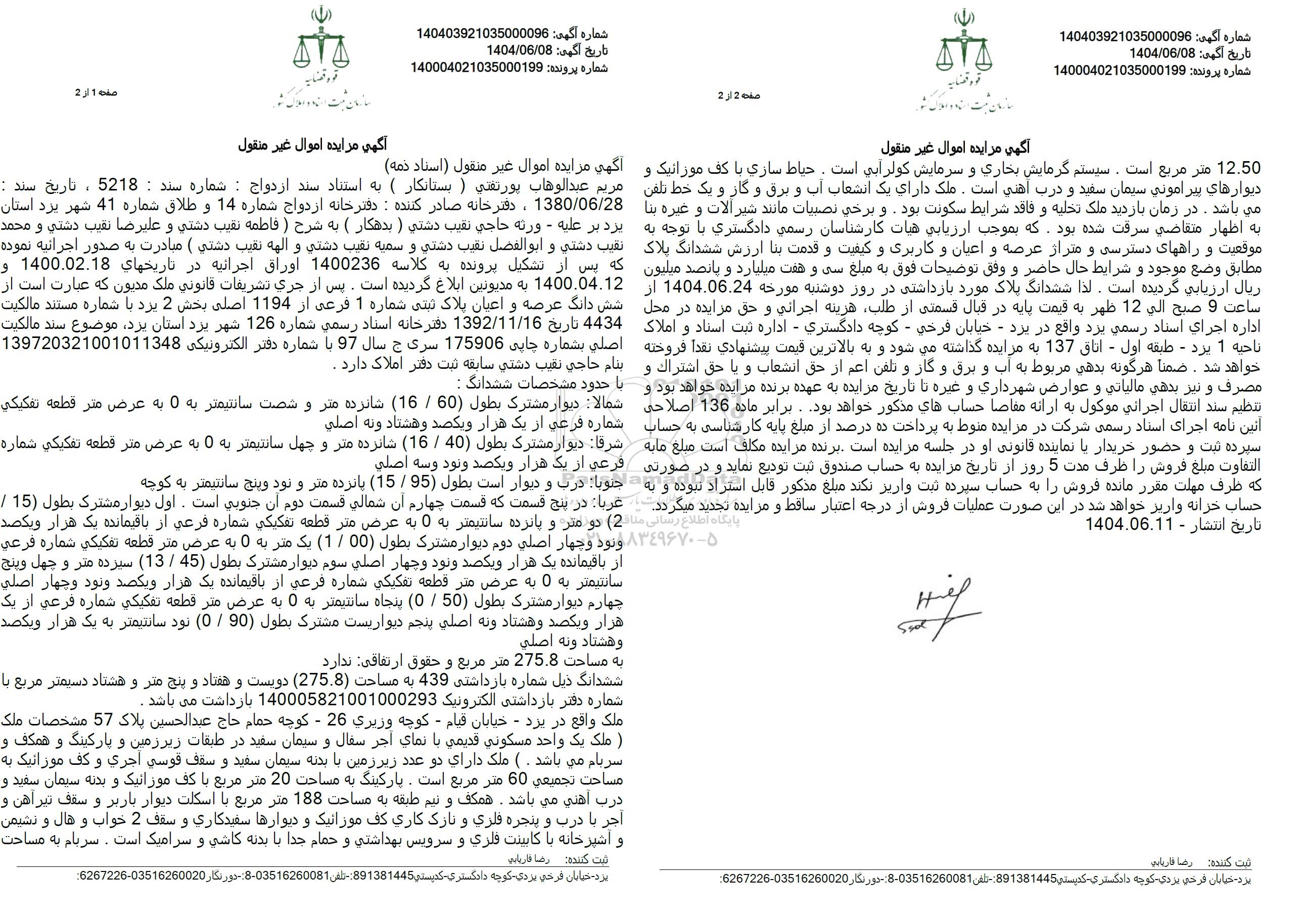 موضوع مزایده :مزایده فروش ملک به پلاک ثبتی 1 فرعی از 1194 اصلی به مساحت 275.8 مترمربع