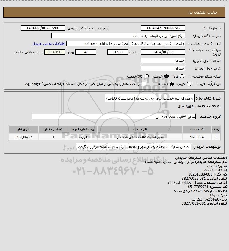 شرح کلی نیاز: واگذاری امور خدمات خودرویی (وانت بار) بیمارستان فاطمیه