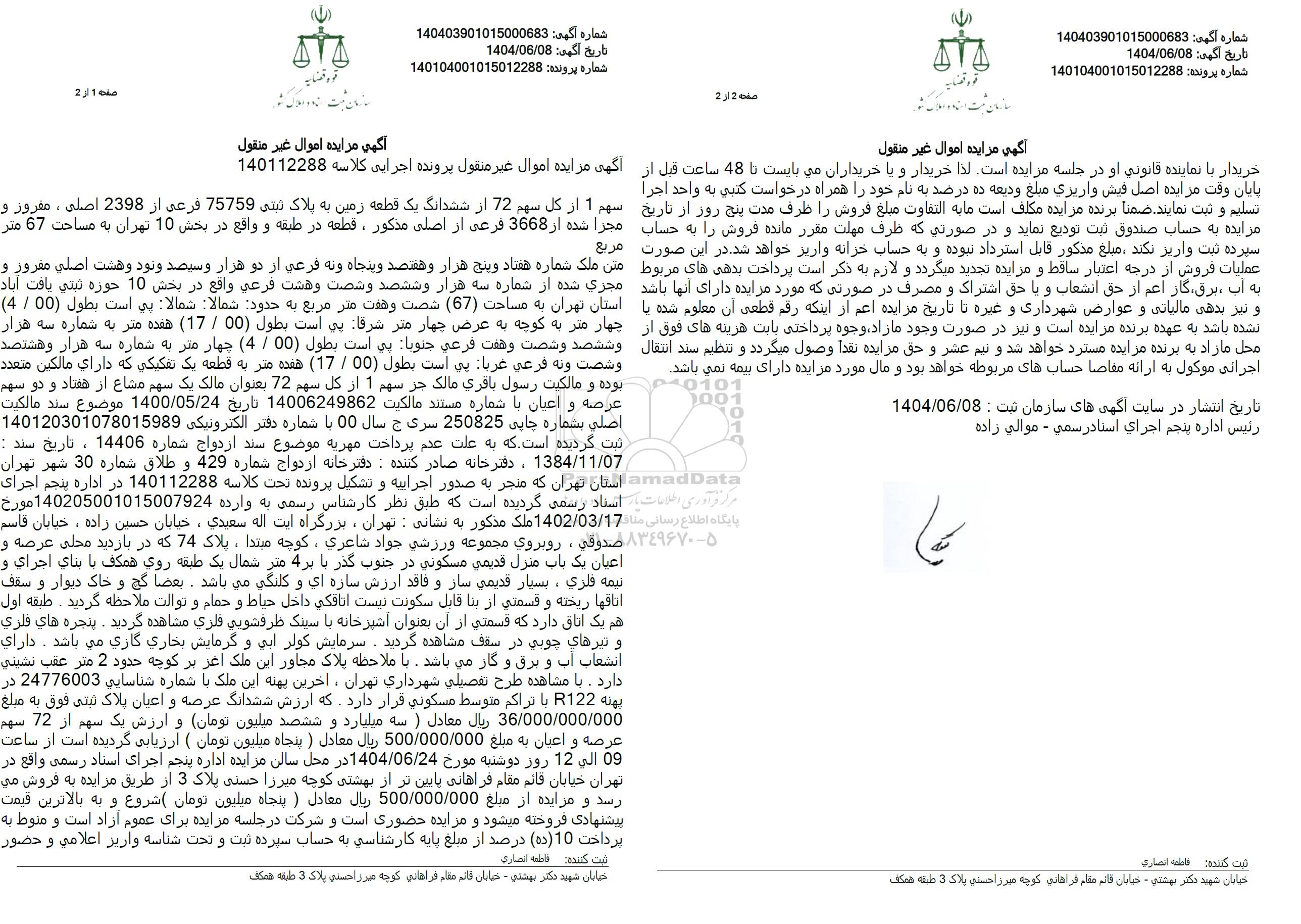 مزایده فروش یک قطعه زمین به پلاک ثبتی 75759 فرعی از 2398 اصلی به مبلغ 36.000.000.000 ریال