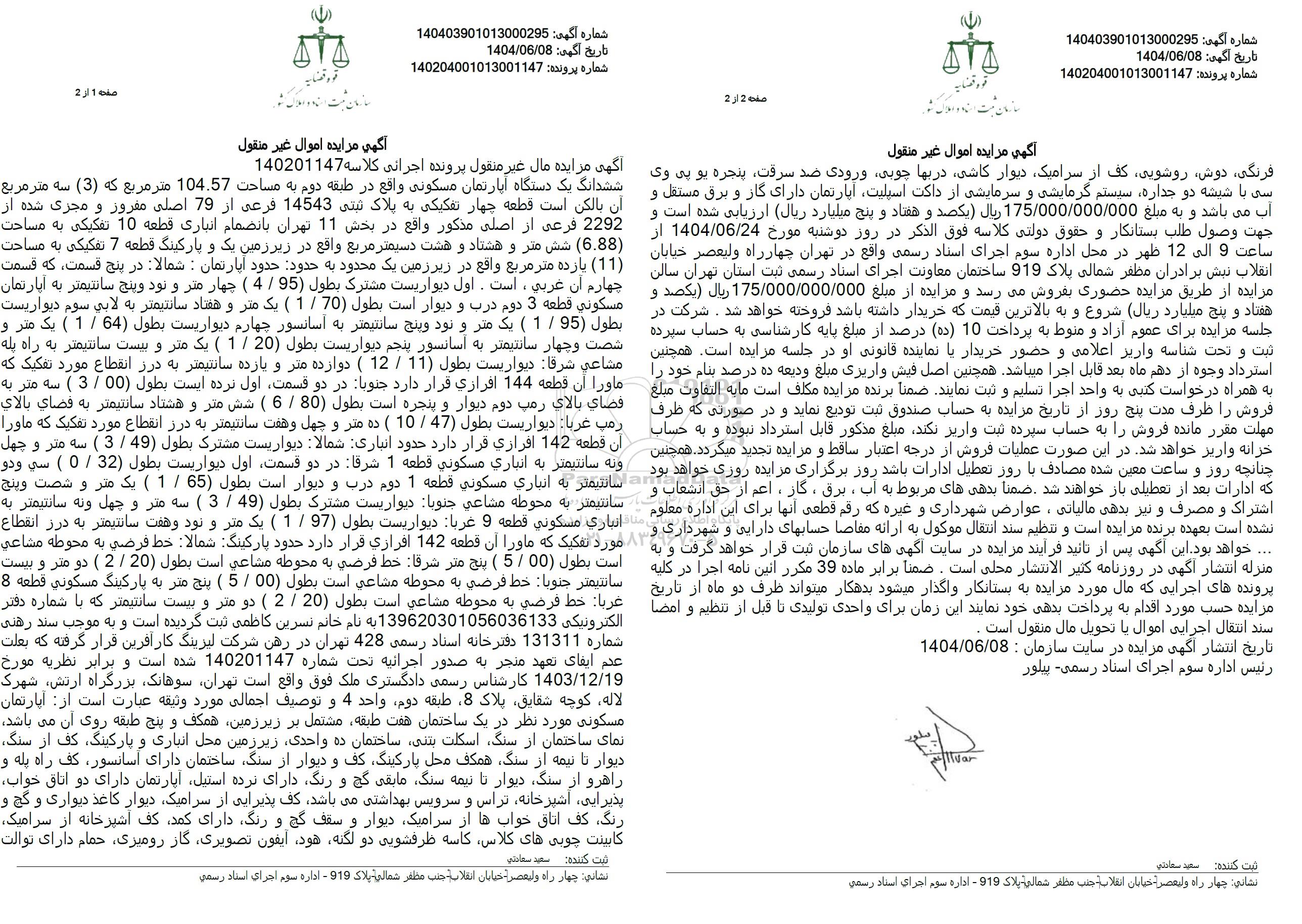 3 مزایده ششدانگ عرصه و اعیان یک قطعه آپارتمان نوع ملک طلق به پلاک ثبتی 72499 فرعی از 6933 اصلی 9708835 1404/07/24 new not special not payed تهران