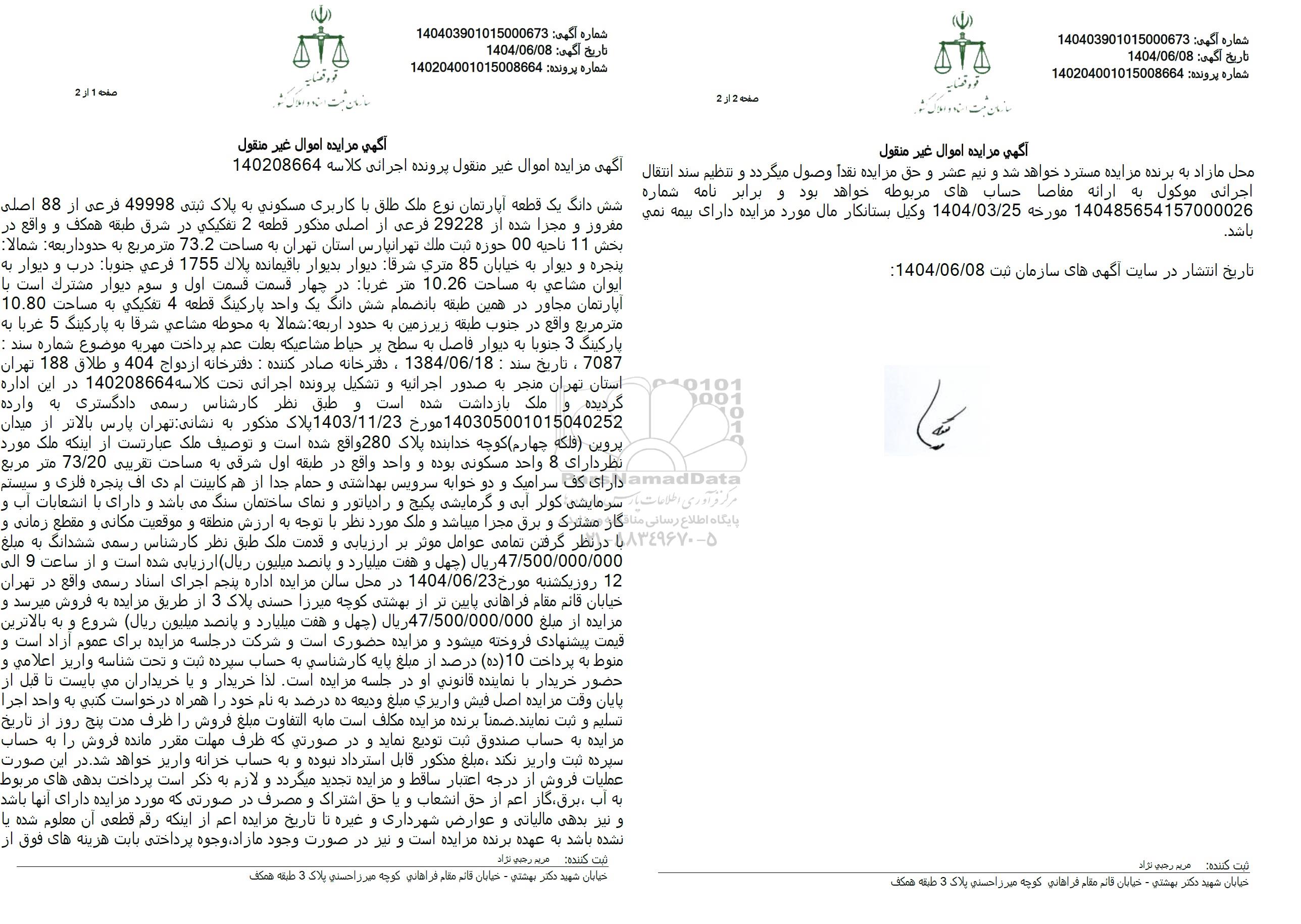 3 مزایده ششدانگ عرصه و اعیان یک قطعه آپارتمان نوع ملک طلق به پلاک ثبتی 72499 فرعی از 6933 اصلی 9708835 1404/07/24 new not special not payed تهران