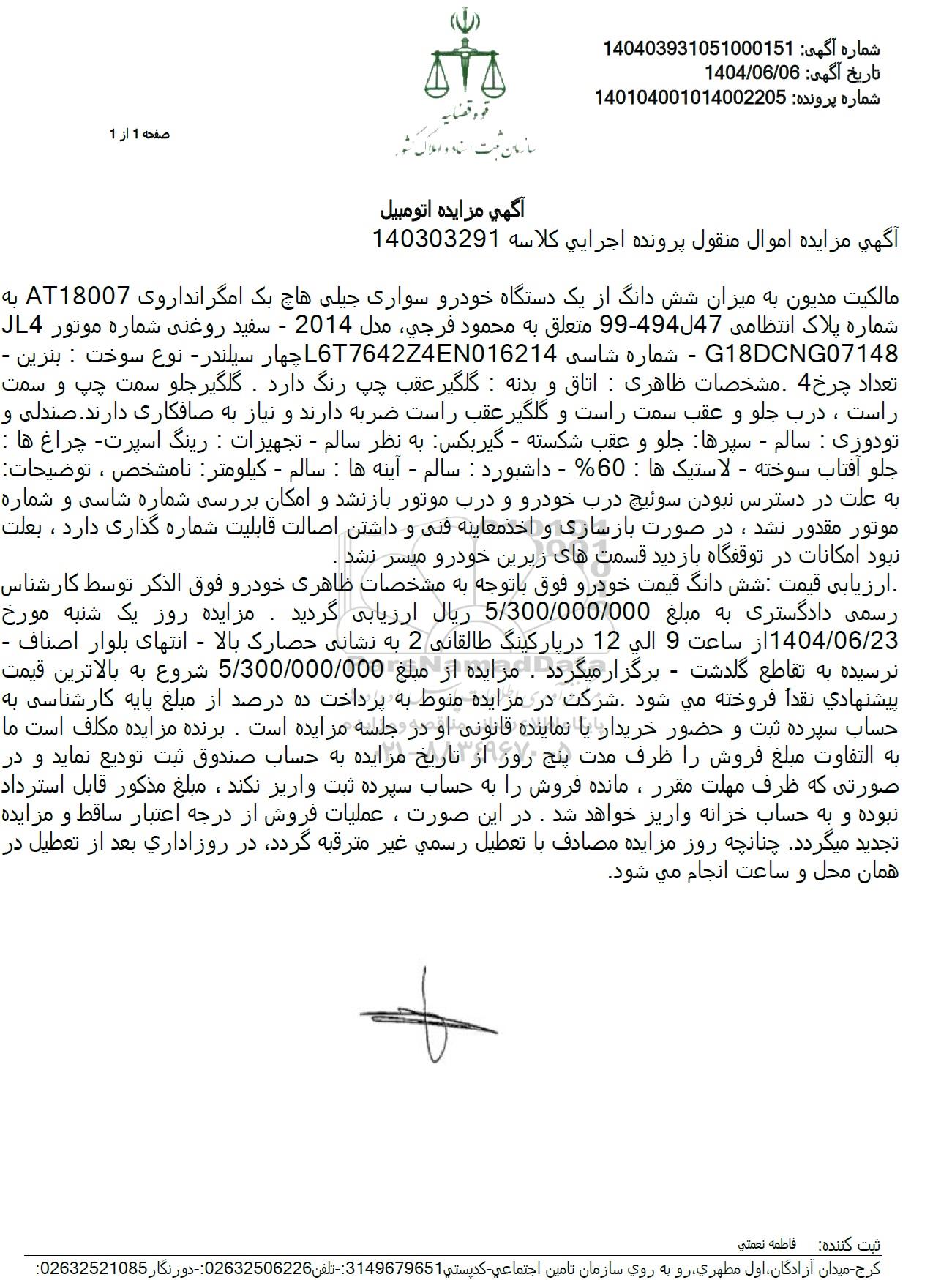 1 مزایده ششدانگ یک دستگاه نیسان وانت زامیاد 9708825 1404/07/24 new not special not payed آذربایجان شرقی