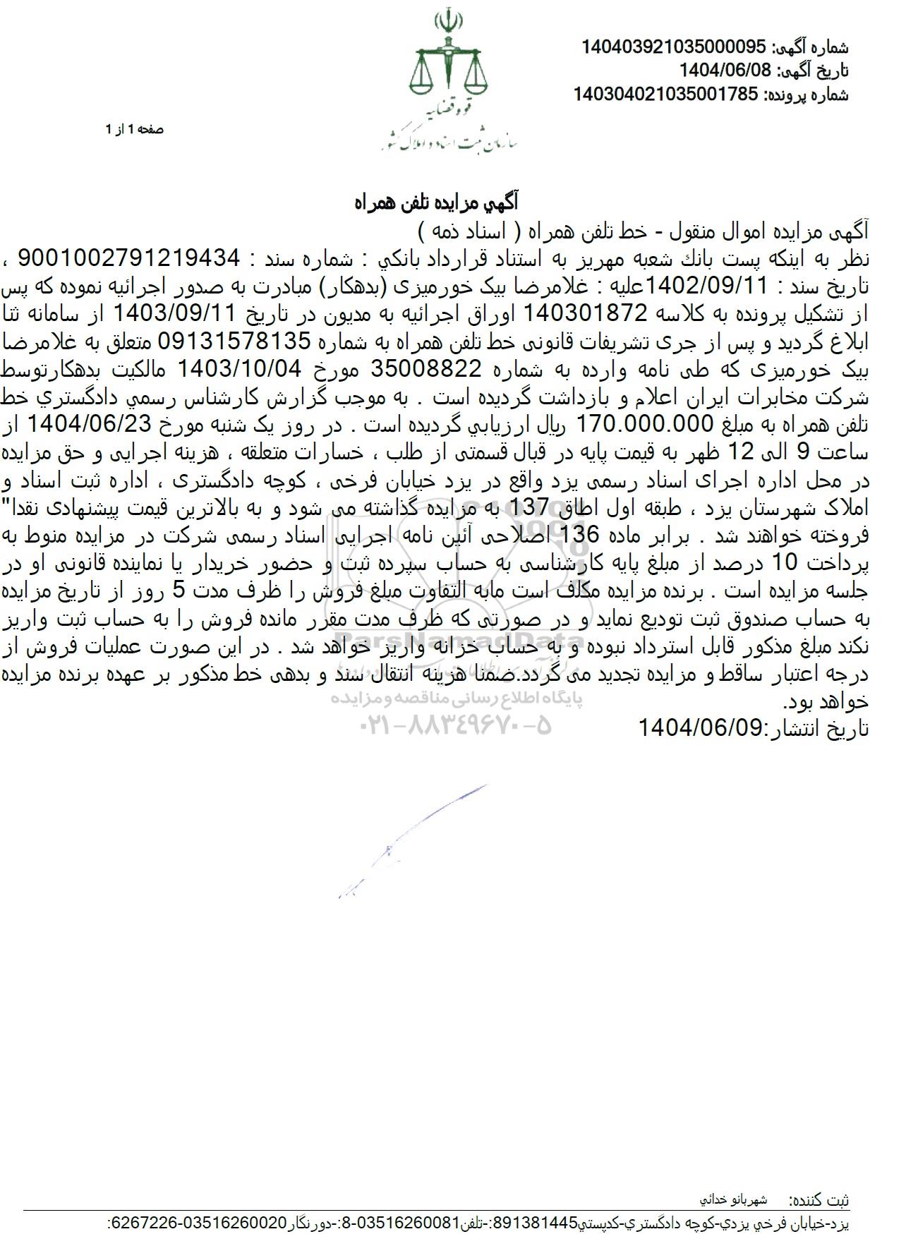 2 مزایده تلفن همراه 9708802 1404/07/24 new not special not payed تهران