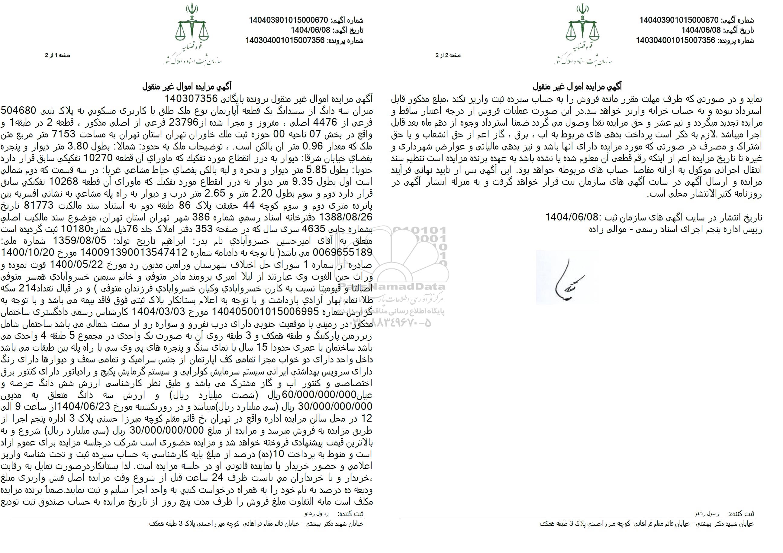 مزایده فروش ملک با کاربری مسکونی به پلاک ثبتی 504680 فرعی از 4476, مزایده فروش ملک با کاربری مسکونی به پلاک ثبتی 504680 فرعی از 4476