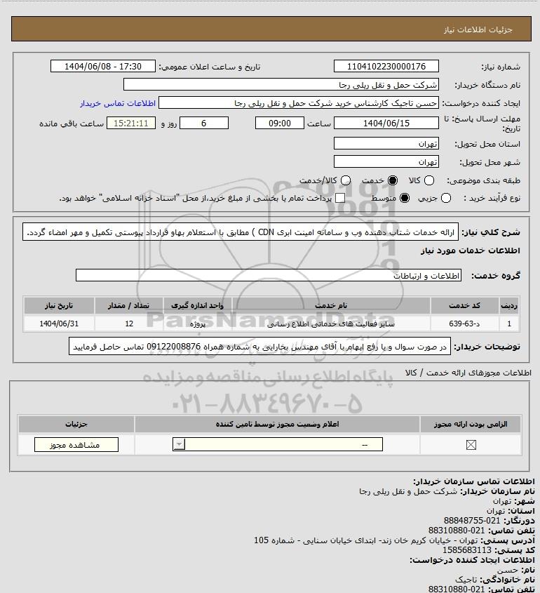 شرح کلی نیاز: ارائه خدمات شتاب دهنده وب و سامانه امینت ابری CDN ) مطابق با استعلام بهاو قرارداد پیوستی تکمیل و مهر امضاء گردد.