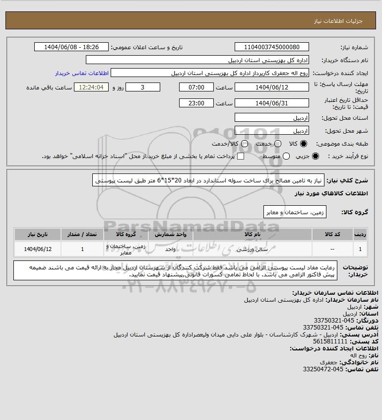 شرح کلی نیاز: نیاز به تامین مصالح برای ساخت سوله استاندارد در ابعاد 20*15*6 متر طبق لیست پیوستی