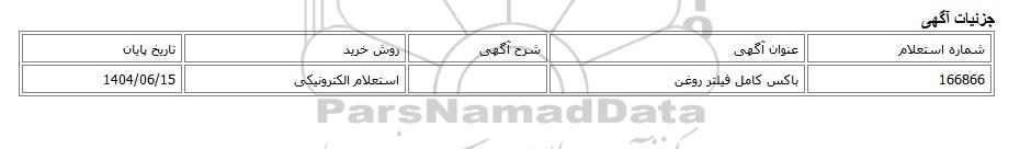 | 166866 | باکس کامل فیلتر روغن | استعلام الکترونیکی | 1404/06/15 |