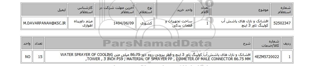 | 52502347 | افشانک و نازل های پاشش آب کولینگ تاور 3 اینچ | 1 | ساخت تجهیزات و قطعات یدکی | کشوری | 1404/06/09 | میثم داورپناه اهوازی | M.DAVARPANAH@KSC.IR |