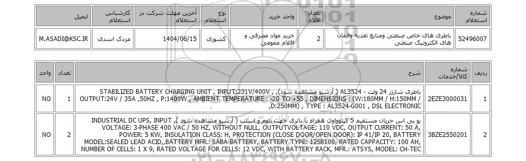 52496007باطری های خاص صنعتی ومنابع تغذیه والمان های الکترونیک صنعتی2خرید مواد مصرفی و اقلام عمومیکشوری1404/06/15مزدک اسدیM.ASADI@KSC.IR