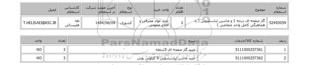 52493059 گاز صفحه ای درجه 1 و ماشین لباسشویی ( با هماهنگی کامل واحد متقاضی )2خرید مواد مصرفی و اقلام عمومیکشوری1404/06/09طه هلیسائیT.HELISAEI@KSC.IR