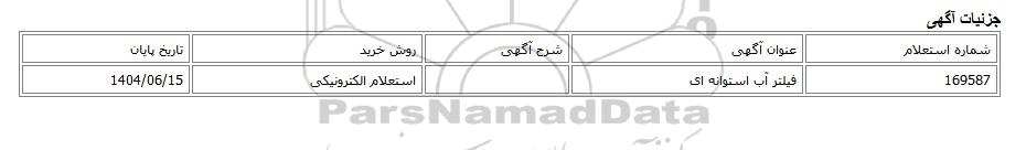 | 169587 | فیلتر آب استوانه ای | استعلام الکترونیکی | 1404/06/15 |