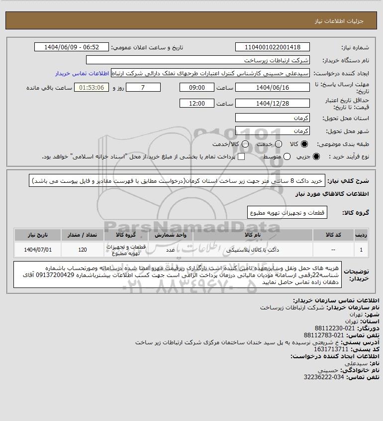 شرح کلی نیاز: خرید داکت 8 سانتی متر جهت زیر ساخت استان کرمان(درخواست مطابق با فهرست مقادیر و فایل پیوست می باشد)