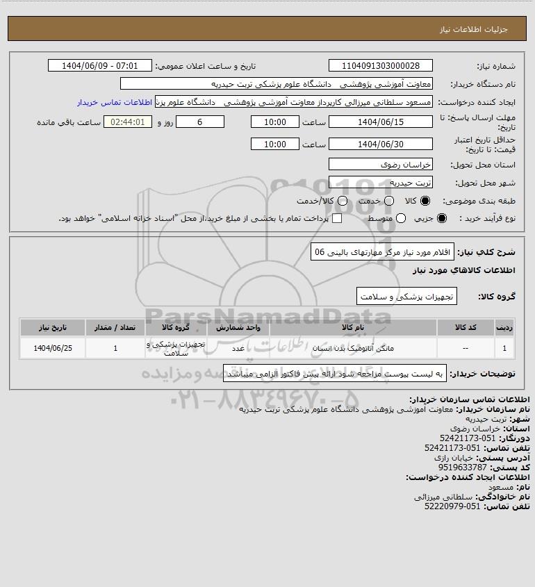 استعلام اقلام مورد نیاز مرکز مهارتهای بالینی 06, استعلام اقلام مورد نیاز مرکز مهارتهای بالینی 06