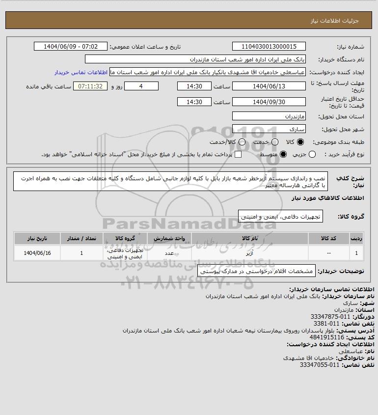 شرح کلی نیاز: نصب و راندازی سیستم آژیرخطر شعبه بازار بابل با کلیه لوازم جانبی شامل دستگاه و کلیه متعلقات جهت نصب به همراه اجرت با گارانتی هارساله معتبر